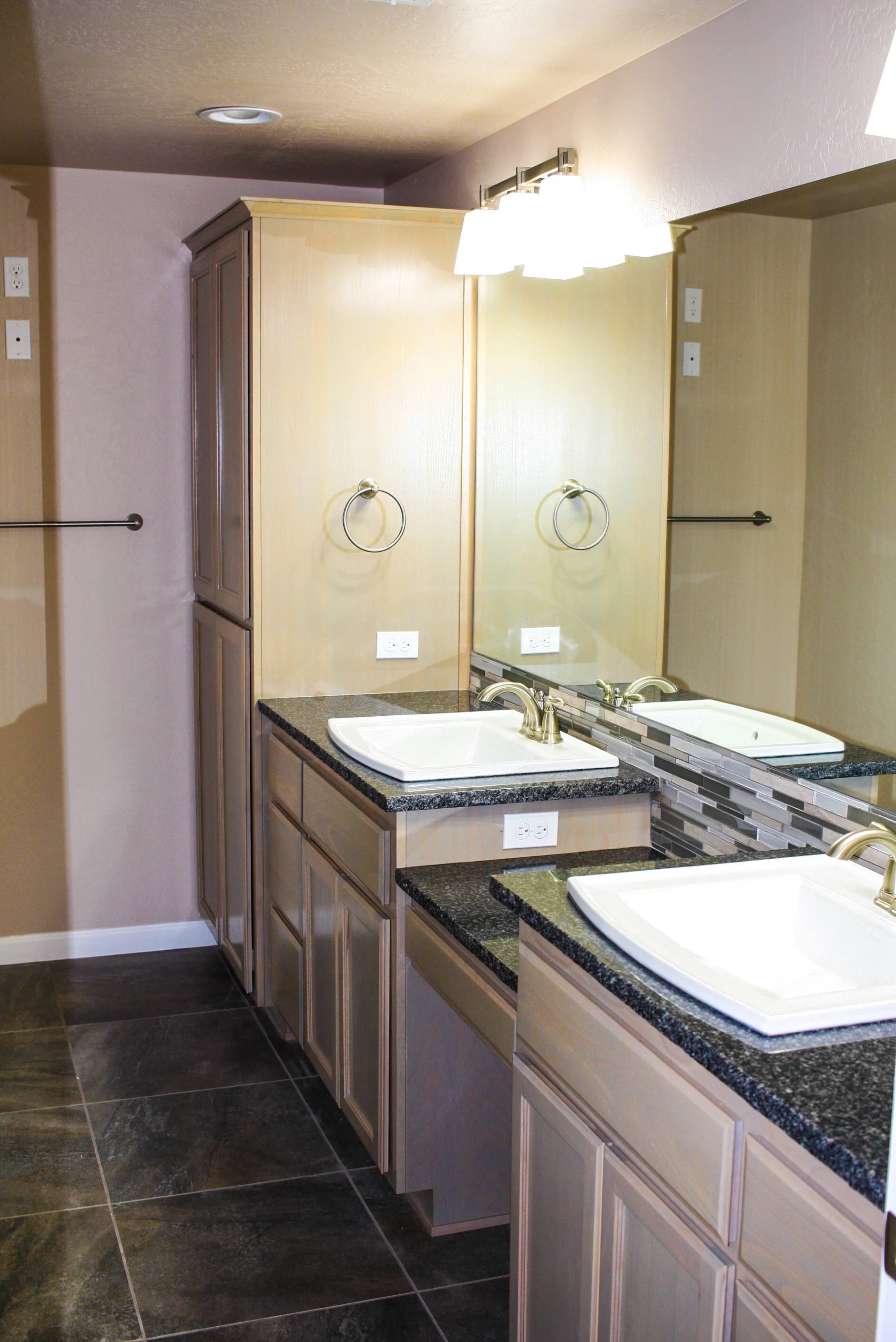 This floor plan offers a split layout with two bedrooms in the front and the master bedroom in the rear, as well as a high entryway that leads into an open kitchen area, dining area, and living area. The three car garage, with the additional graveled-in side yard, allow for plenty of storage space. This particular model shows the upgraded tile showers that are available, as well as the upgraded laminate throughout the main living space.